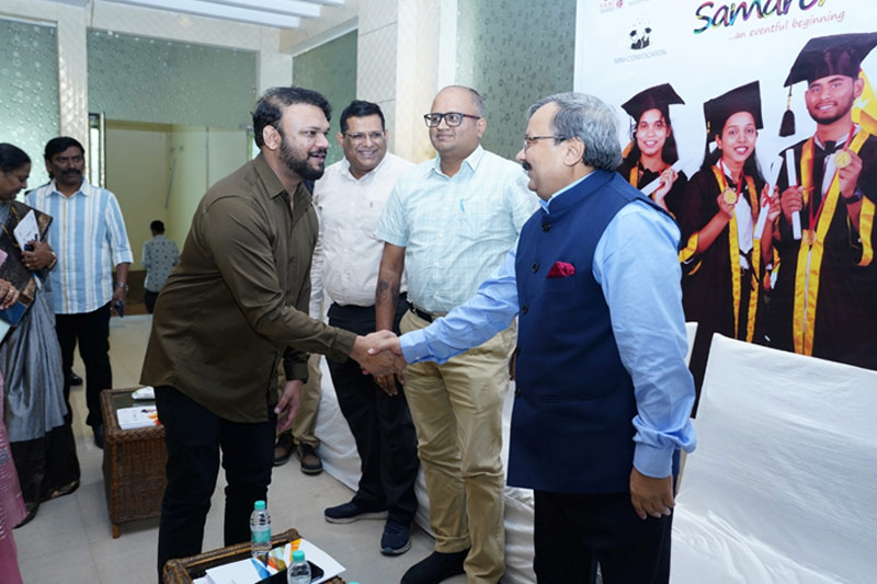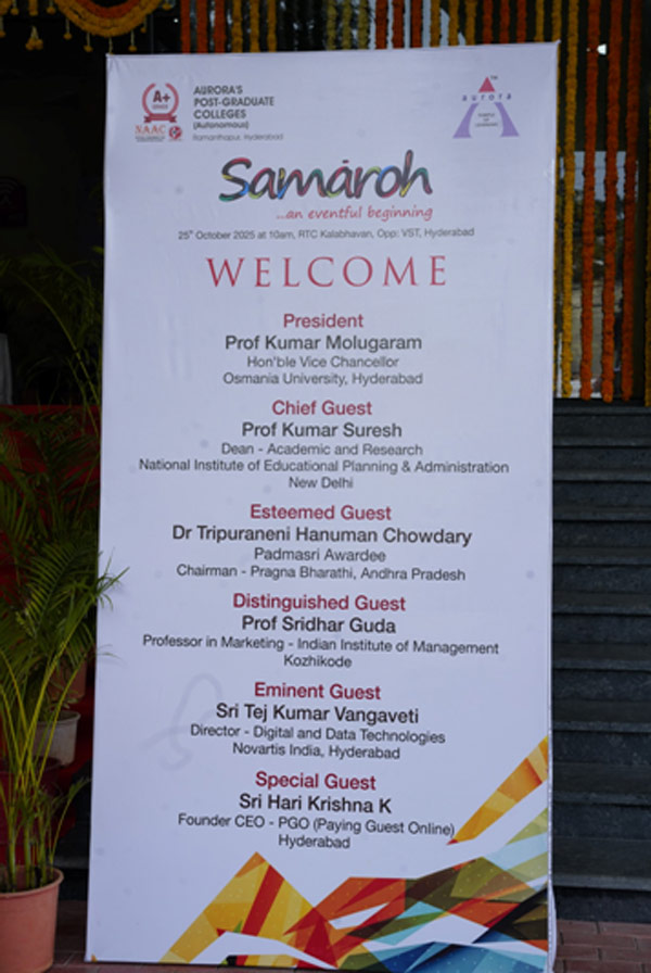 To honour the first autonomous batch (2023-25), the Management Club – Anushasan organised ‘Samaroh,’ a grand convocation at RTC Kalabhavan, Baghlingampally on 25th October, 2025. The ceremony opened with the divine ‘Lakshmi Narasimha Pancharatnam,’ a hymn by Jagadguru Adishankaracharya, invoking blessings of strength, prosperity and wisdom—symbolising the balance of courage and compassion essential for new beginnings. The event featured sessions of ‘Abhijnanuvakam’, celebrating meritorious students, ‘Abhijnanuvakam’, awarding degrees and sharing spiritual insights through ‘Spoorthi Bhashanam’ by eminent spiritual leaders.
