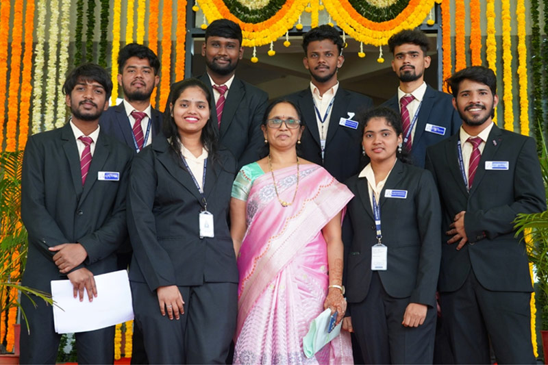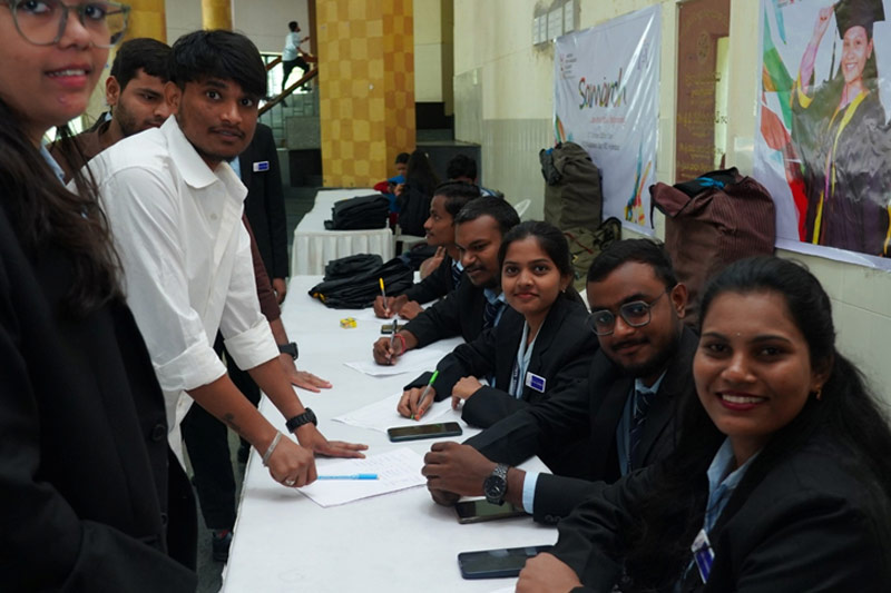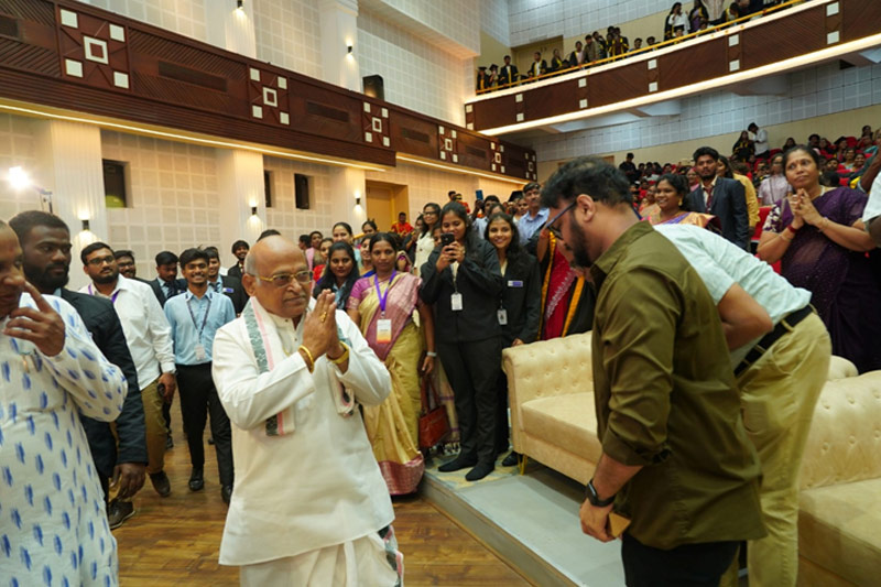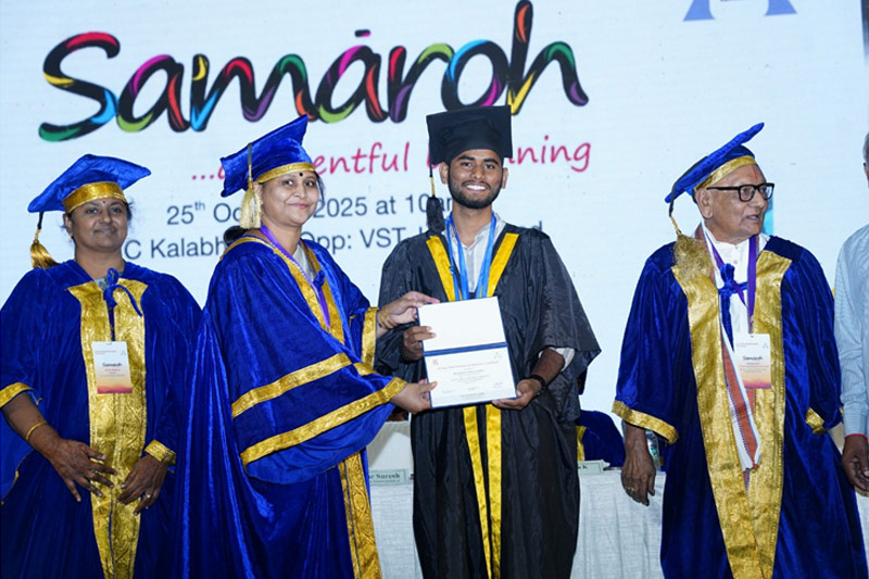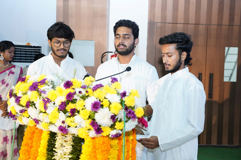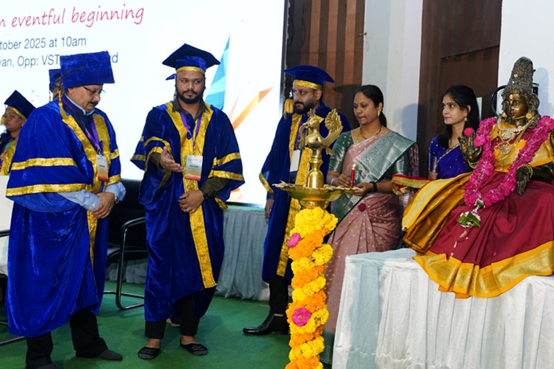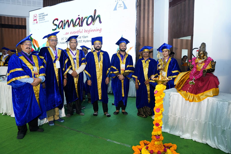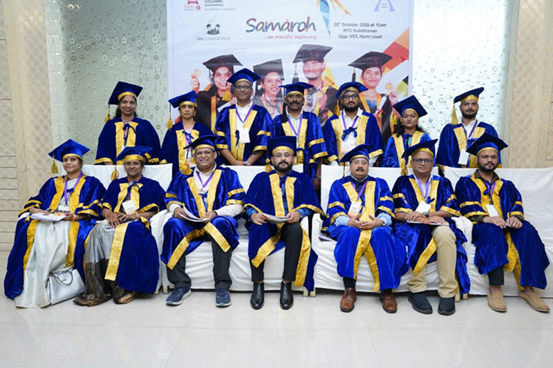 To honour the first autonomous batch (2023-25), the Management Club – Anushasan organised ‘Samaroh,’ a grand convocation at RTC Kalabhavan, Baghlingampally on 25th October, 2025. The ceremony opened with the divine ‘Lakshmi Narasimha Pancharatnam,’ a hymn by Jagadguru Adishankaracharya, invoking blessings of strength, prosperity and wisdom—symbolising the balance of courage and compassion essential for new beginnings. The event featured sessions of ‘Abhijnanuvakam’, celebrating meritorious students, ‘Abhijnanuvakam’, awarding degrees and sharing spiritual insights through ‘Spoorthi Bhashanam’ by eminent spiritual leaders.